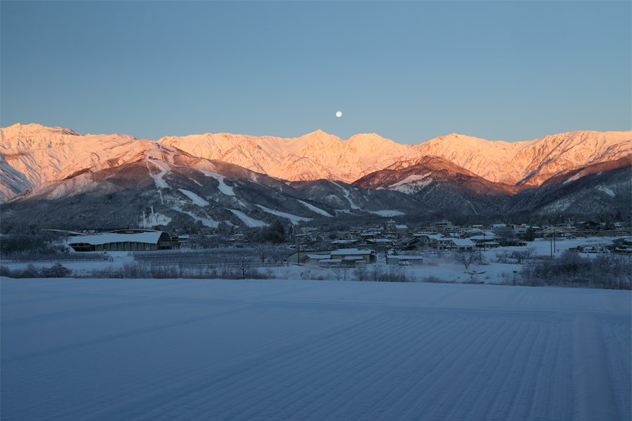 気温が-10℃を下回っていた朝6時40分。白馬ハイランドホテル に向かう途中の上り坂で暗いうちからカメラを構えていると、後立山連峰の最高峰、白馬岳(写真一番右、標高2,932m)の頂が赤く染まり始めました。20分と経たないうちに白馬三山全体が朝焼けに包まれて、今年最後の満月「コールドムーン」との共演を楽しめました。