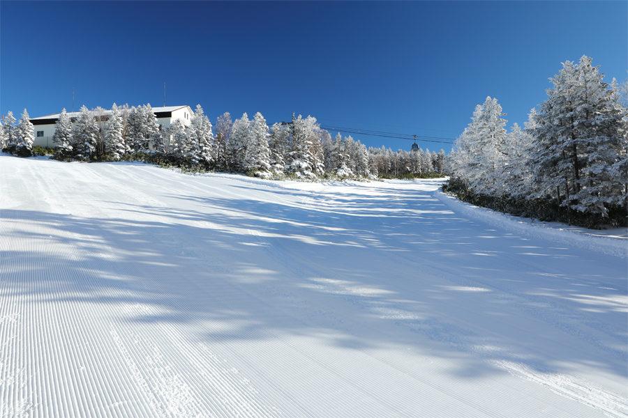 適度に締まった粉雪の圧雪のパノラマコース(写真)ではエッジがよく噛み板が走り、思い通りのターンを切れました。オープン初日+最高の天気とあって「いつも見てます。」「今シーズンもよろしくね!」と数多くのお声掛けを頂きました。