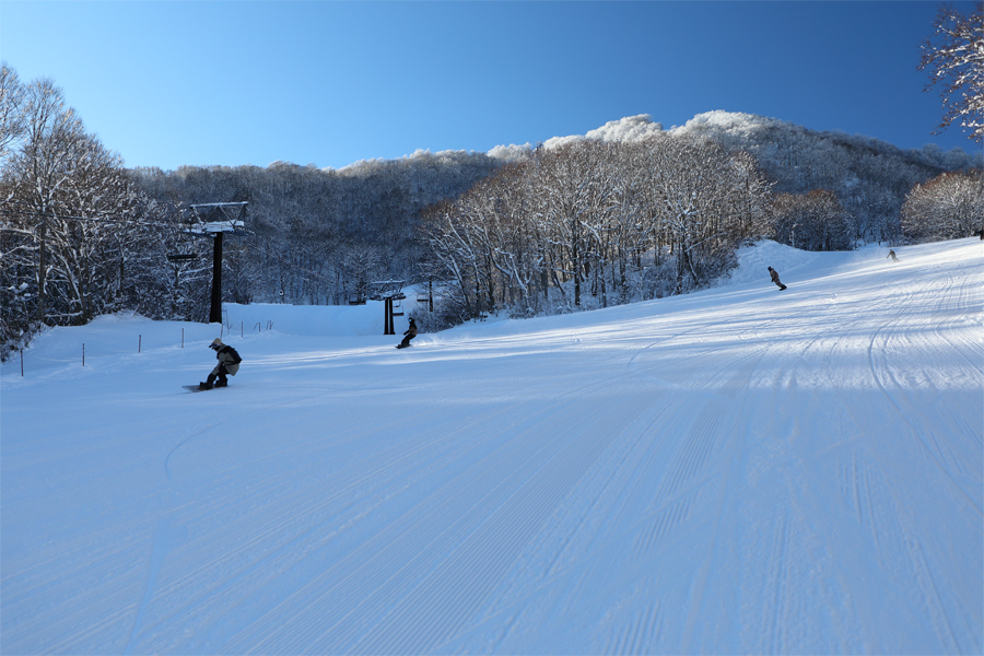 ルート1下部も前半(写真)は適度に柔らかな粉雪の圧雪。しかし、非圧雪の後半は不規則な起伏ができていた上に、人工降雪機周辺がカリカリのアイスバーンで難しかったです。上級者の方でも圧雪されたルート7で下山するのがおすすめです。
