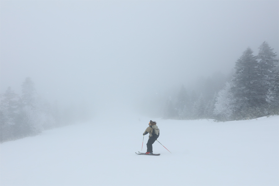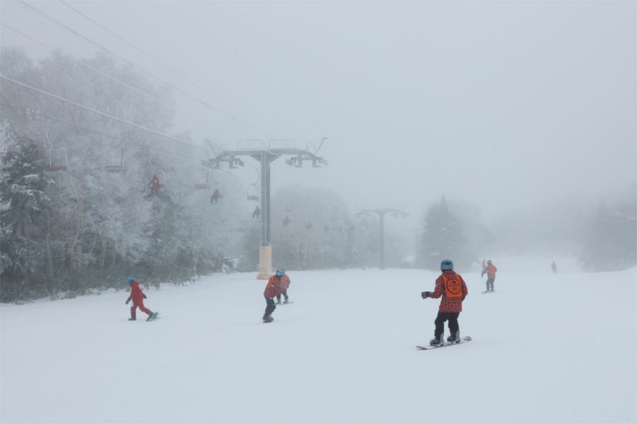 適度に締まった粉雪の圧雪バーン、第2ゲレンデ(写真)は最大22度、平均11度、距離約2,000mの中~緩斜面。弱い雪降る今朝は薄いガスもかかっていましたが、視界が遮られるようなことはなく、気持ちよくターンを繰り返せました。尚、第1ゲレンデ(最大7度、平均5度)と合わせれば、初級者でも約3.2kmのロングランを楽しめます。
