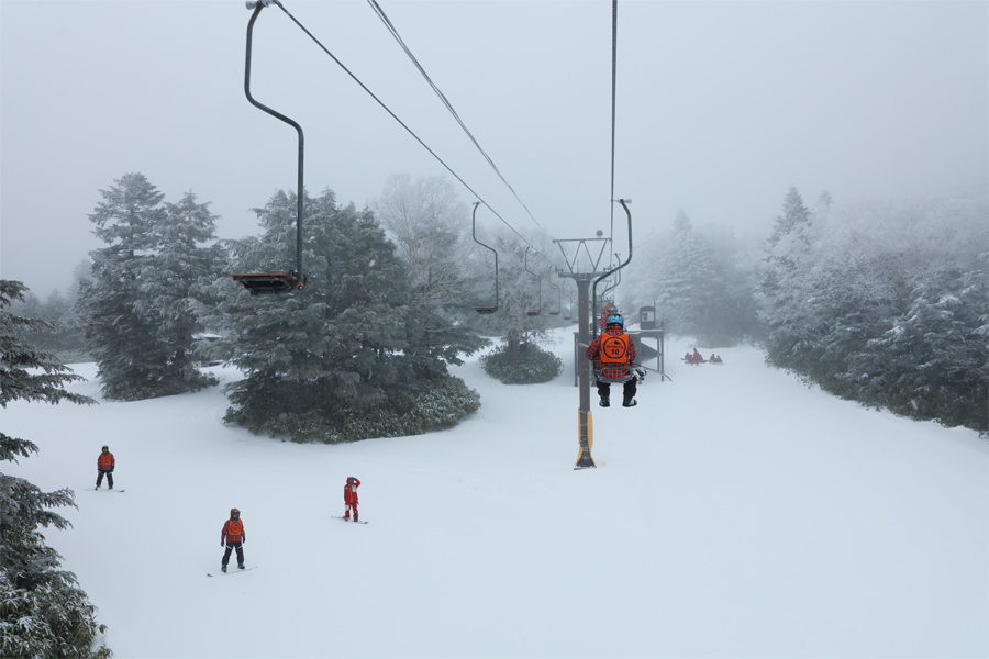 針葉樹に囲まれた雰囲気のあ第5ゲレンデ(写真)にはシングルリフト(391m)が架かっています。「日曜日から修学旅行に来ています。スノーボードは初めてですが楽しいです!」とは山口県からの生徒さんたち(写真)。周囲の木々の霧氷を愛でながら、適度に締まった粉雪の圧雪の緩斜面をゆったりとした気分で滑りました。