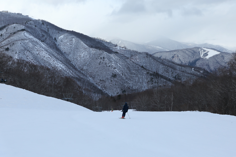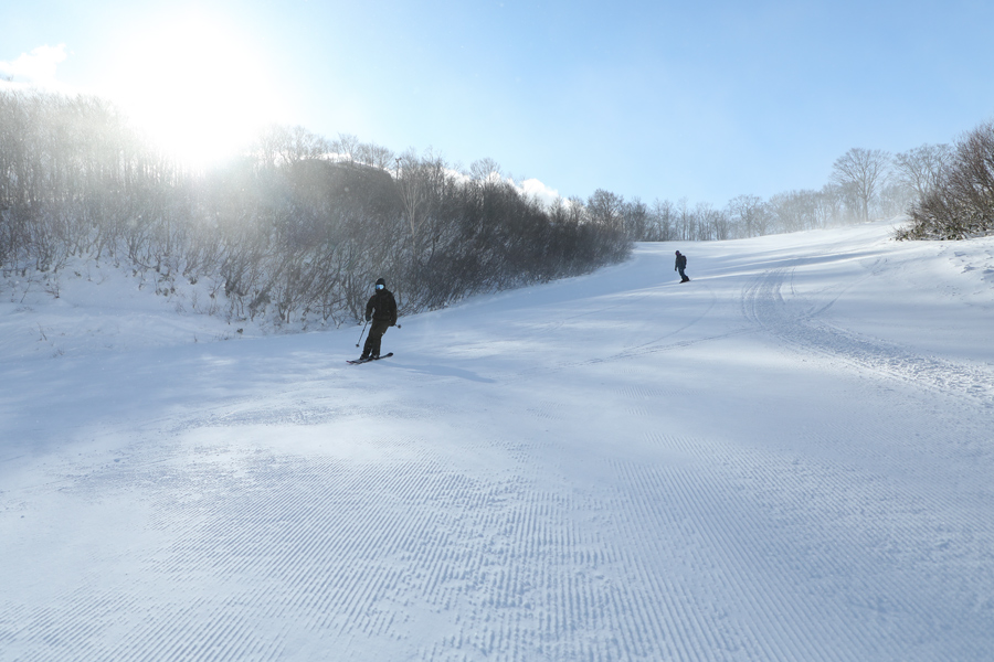 Line-E乗り場から下(写真)は締まって硬めの圧雪。ターンを切る度に薄っすらと乗った新雪がふわりと舞い上がりました。湿雪と粉雪が混ぜられプレスされたルート1上部は適度に締まった圧雪、硬めの起伏ができたルート2とルート3は全面非圧雪、ルート8下部は硬めの湿雪の圧雪でした。