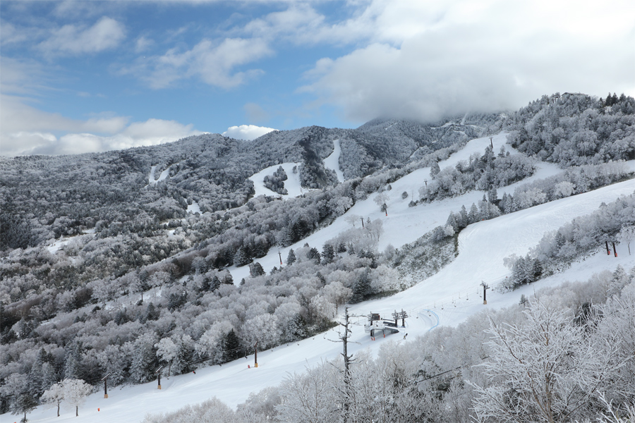11/21(金)に第2初級コースからスタートした 熊の湯スキー場(写真)では、翌11/22(土)に第3初級が、11/29(土)に馬の背、12/6(土)に第4初級、第4イベント、第4Aが滑走可能になりました。昨日の霧氷が融けずに残っていて、第2ペア山頂駅から第4Aコースへ向かうと一面真っ白な世界が広がりました。
