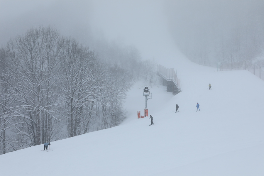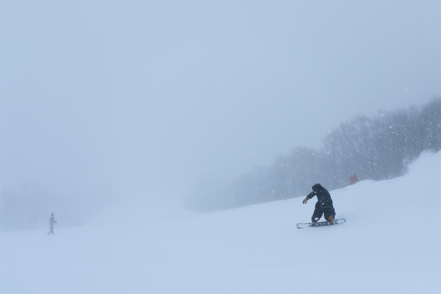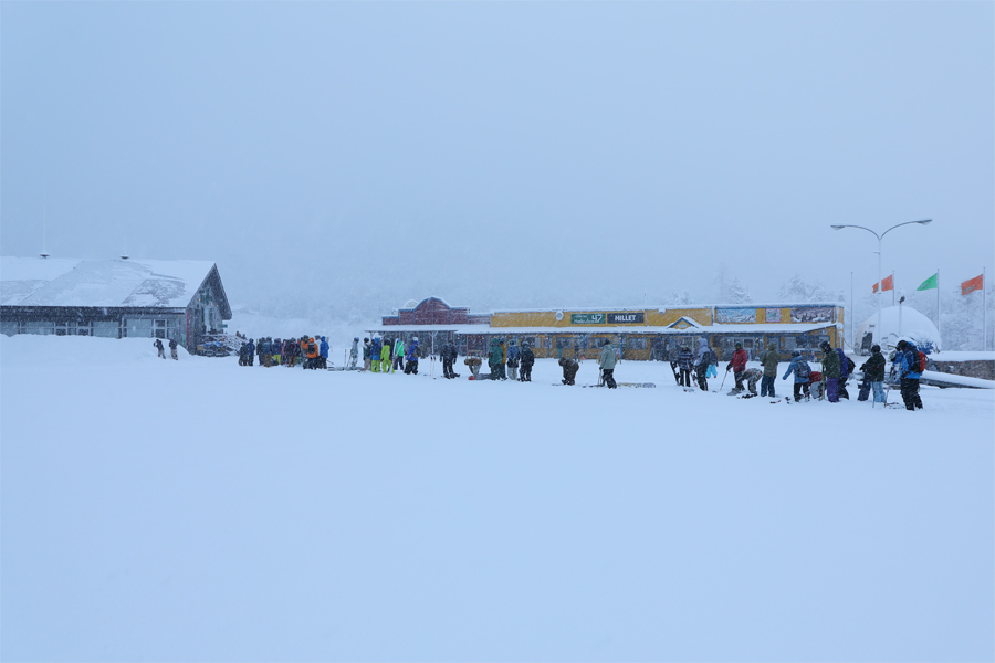 早朝のまだ薄暗い時にお会いしたスキーヤーさんが「昨晩着いた時は暴風雪でした。今朝のゴンドラを心配しましたが、動いて良かったです。新雪はやはり気持ちがいいですね!」とお話しくださいました。しんしんと雪が降る中、ゴンドラ Line-8 乗り場には乗車待ちの列がレストラン ALICE 前まで続いていました。