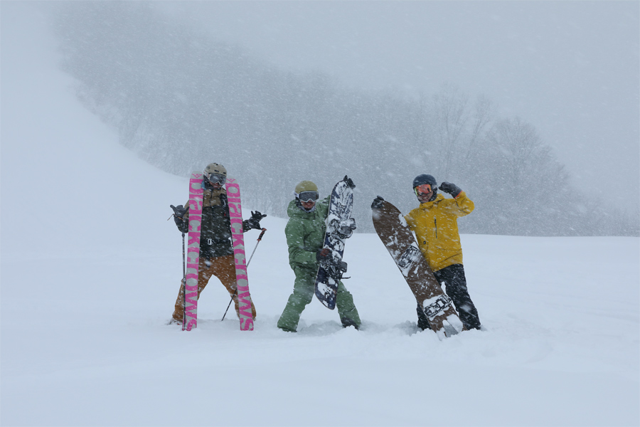 その後、大町市からの男性に再びお会いしたところ、「ルート2は新雪が30cmくらいあって良かったですよ。滑った後は、15年研究して来たうちの麻婆豆腐を是非食べに来てください!」とお話くださいました。以前会ったことがあるなと思っていたら『大町食事処 渓』のオーナーさん(写真中央)だったのでした。この頃、雪の降り方が強まり、ガスもあって雪面が少々見にくくなりました。