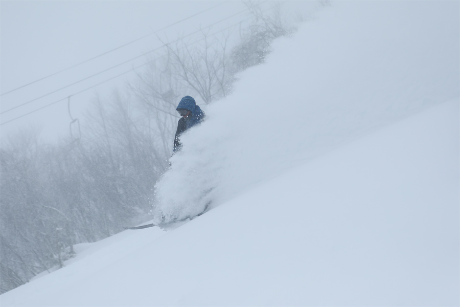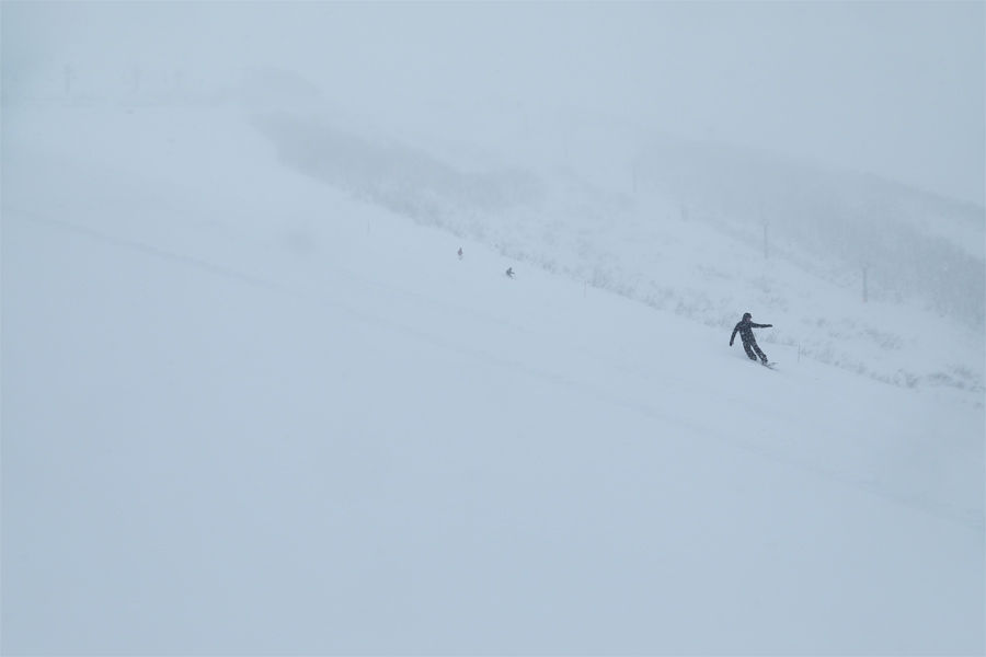 フカッとした新雪が15~20cm乗った黒菱第2クワッド沿い(写真)は適度に締まった粉雪の圧雪。良く締まった湿雪の圧雪のパノラマコースに積もった新雪約10cmには、兎平、黒菱両ゲレンデに比べて少々重さを感じました。この後、9時頃から雪の降り方がさらに強まりました。