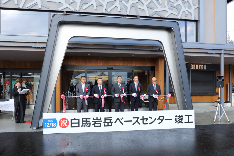 明日12/19(金)の 白馬岩岳スノーフィールド のオープンに先立ち、12/18(金)の朝10時から「ベースセンター」の竣工式が始まりました。スキー場の関係者らによる神事とテープカット(写真)のあと、内覧会が行われました(※チケットセンターは写真の右側です)。