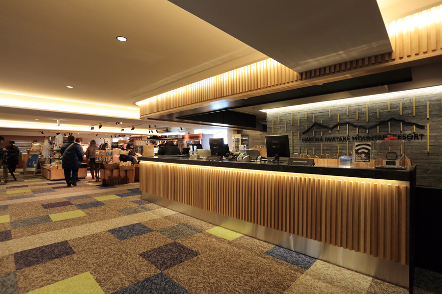 中に入ると旧ゴンドラ山麓駅と同じ建物とは思えないような落ち着いた雰囲気の空間が広がりました。インフォメーションカウンター(写真手前)の奥の売店には、お菓子や漬物といった信州の土産品をはじめ、アパレルや帽子、グローブ、ゴーグル等が並んでいました。写真左手には自販機、コインロッカー(※大きさ別に200円~600円)、更衣室がありました。