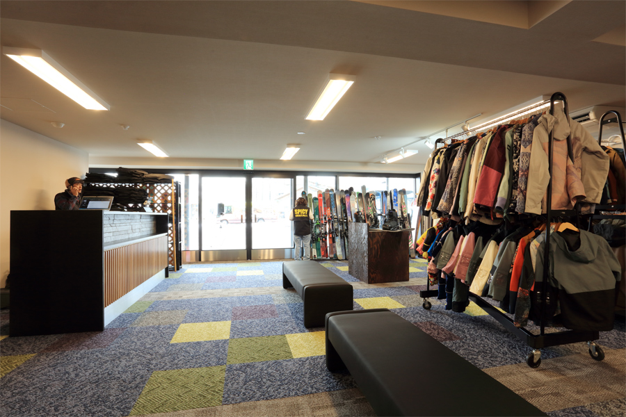 最も大きな変化は昨シーズンまで別棟だった SPICY RENTALS(写真)がベースセンターの一角に入ったこと。初級者から上級者まで幅広く対応するスキー、スノーボードの板、ブーツ、ウェアはもちろん、子供用の板、ブーツ、ウェア(写真右手前)も充実。また、観光客向けのスノーブーツのレンタルも用意されていました。