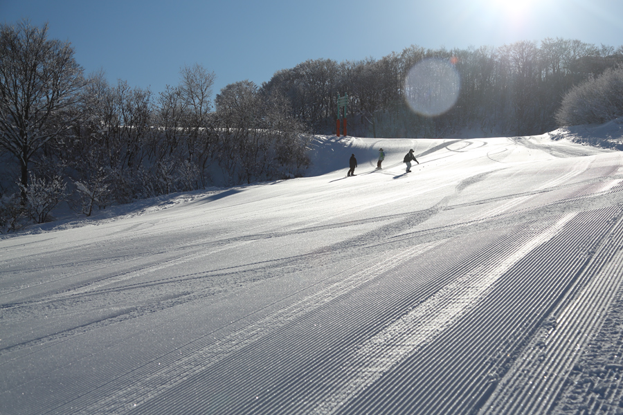 良く締まった粉雪の圧雪のルート1上部(写真)では板が良く走りました。それを生かしてノンストップで滑り降りては Line-C で上り返す上級者が目立ちました。非圧雪のルート1下部の序盤は良く締まった起伏、中~終盤は硬い下地に人工雪が乗った難しいコンディションでした。