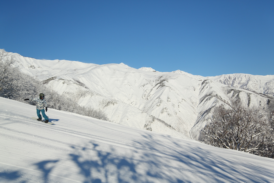 ルート8下部(写真)は程よい締まり具合の滑りやすい粉雪の圧雪。朝一番はルート1上部か Line-E へ向かう人が大半だったため、ここは五竜岳を眺めながらのんびりと滑れました。非圧雪のルート2とルート3には締まった起伏が出来ていました。