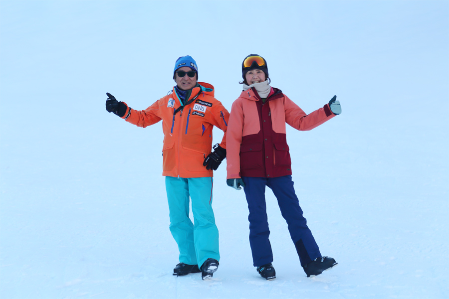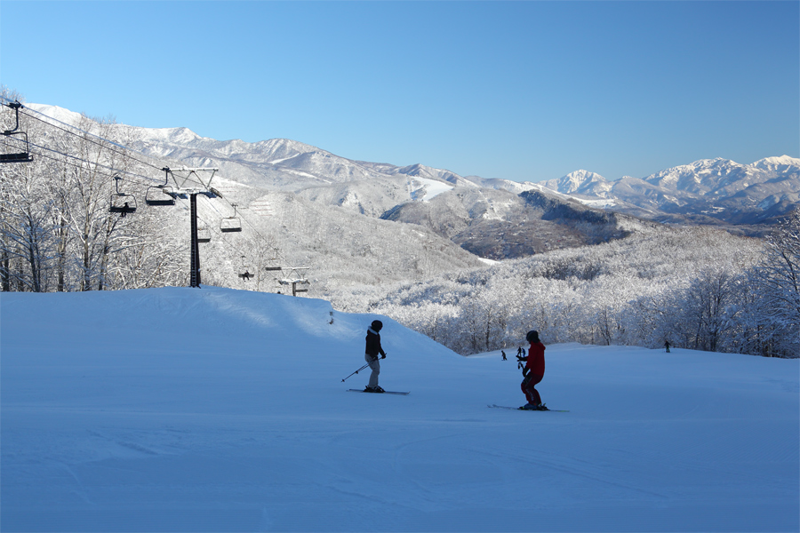 営業開始前にお会いした埼玉県からのご夫婦(写真)が「いつも見てます。今シーズン初の白馬です。スキー場上部からの景色も楽しみですが、今晩泊まる ホテル白馬 の客室からの景色も楽しみです。」とお話しくださいました。快晴、無風のもと昨日に降り積もった雪と霧氷で白く染まったゲレンデがきれいな朝でした。