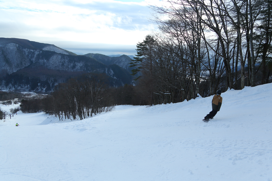 その後、12/16(火)の午後に第3ペアが運行を開始し雷鳥コース(写真)とラビットコース上部がオープンして「大部分可(=50%以上可)」になりました。良く締まった粉雪(!)の圧雪の雷鳥コース(写真)では、少しあったブッシュを気にすることなく快適にターンを繰り返せました。