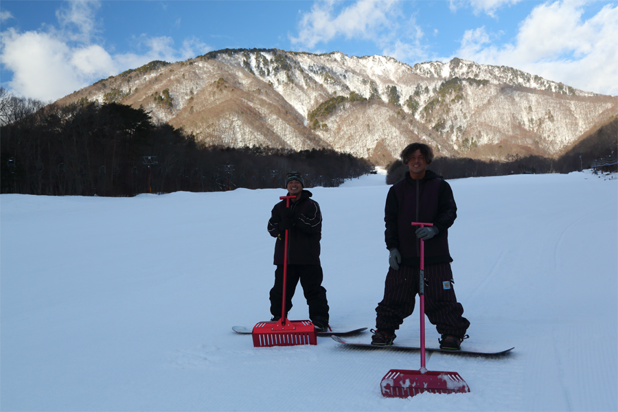 暖気の流入が北方のスキー場よりワンテンポ遅れたのか、圧雪のエコーゲレンデ(写真)も適度に締まった粉雪コンディションでした。また、第1ペア側には、最新の人工降雪機のお陰もあってブッシュや積雪の薄い箇所はなし。爺ガ岳パーク大町 のディガーさん(写真)が「今シーズンもよろしくお願いします!パーク初級者でも楽しめるように毎日バッチリ整備しています。是非遊びに来てください!」とお話しくださいました。