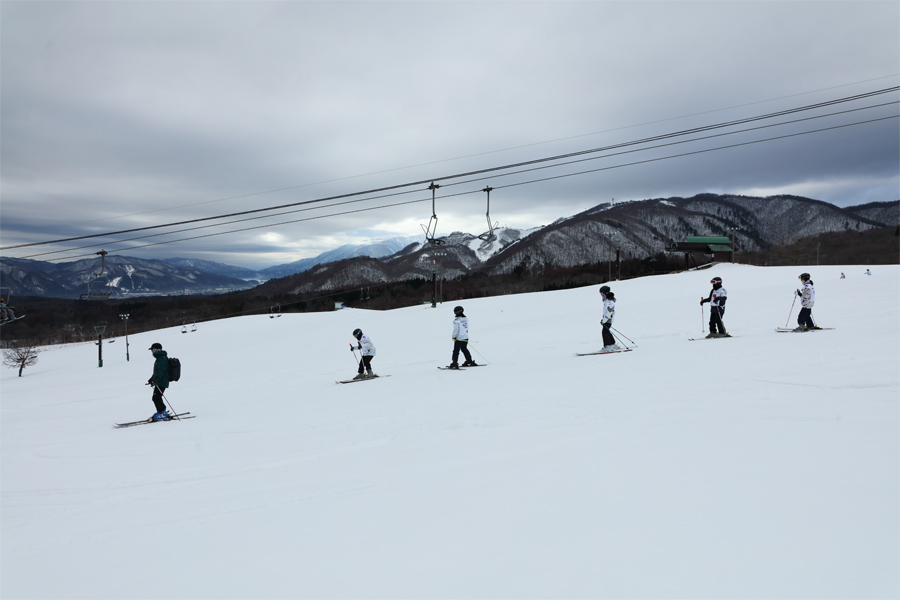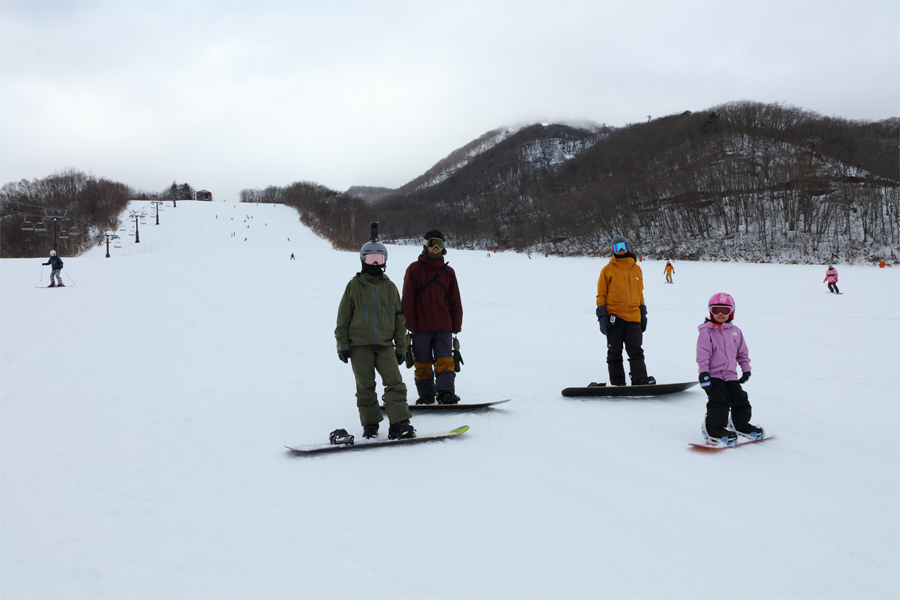 ハンの木ゲレンデ、丸山ゲレンデともに適度に締まった滑りやすい湿雪の圧雪。松本市と金沢市からの2組のご家族が「いつも見てます!現地集合で滑りに来ました。中学2年生の息子(写真一番左)と小学1年生の娘(写真一番右)の2人が NSDキッズプログラム のお世話になっています。」とお話しくださいました(※丸山には一部にブッシュ有)。