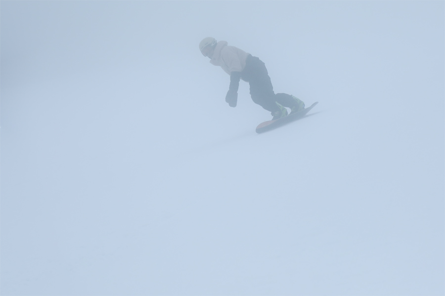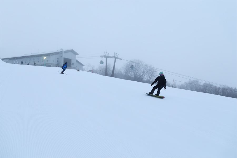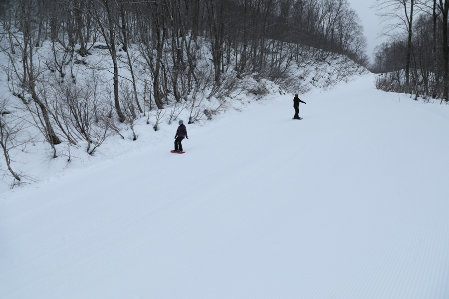 乾いた雪が薄っすらと乗ったルート1上部(写真)も硬めの湿雪の圧雪でした。ただし、濃いめのガスが掛かっていたためスピードを落として滑りました。ルート1上部からルート6へと下る急斜面は非圧雪。硬い起伏で腰やヒザを傷めないよう慎重に滑りました。