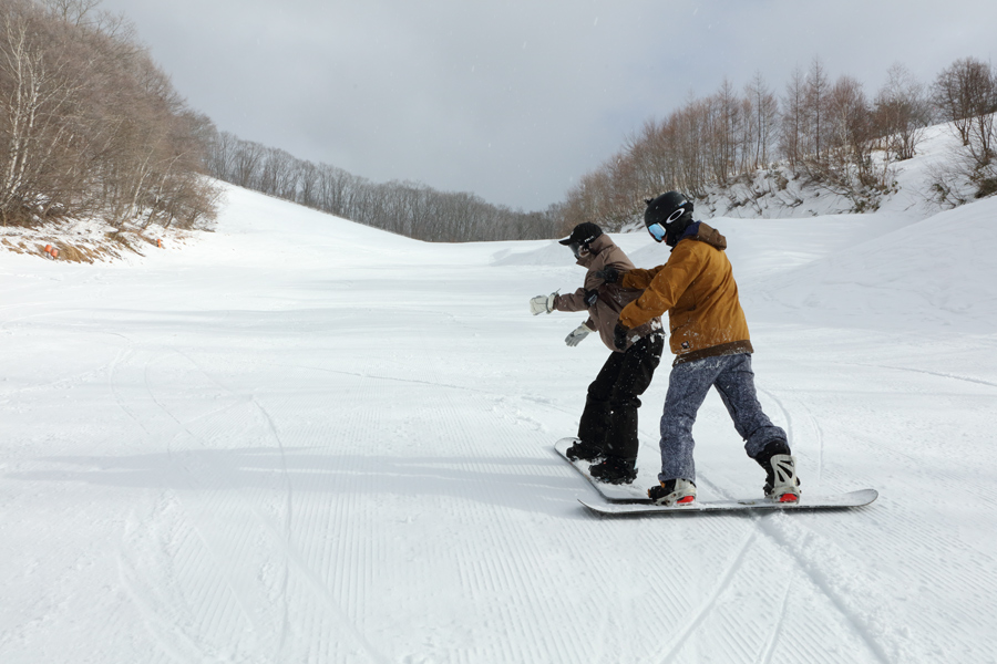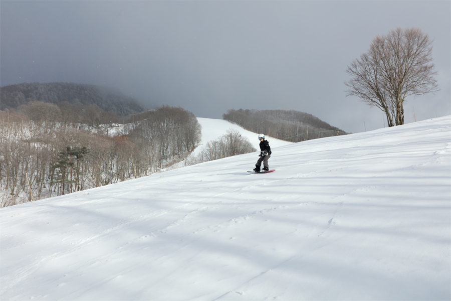 という訳で、気持ちよく滑れるのは黒沢ゲレンデとコース1-C終盤(写真)の2コースでした。「スノーナビは見たことあります。僕(写真右)は数年ぶりの鹿島槍です。彼女(写真左)は3年ぶりのスノーボードで、すっかり初心者に戻っています。」とは松本市からのお2人。圧雪された両コースは硬めの圧雪でした(※一本ブナは本日クローズ)。