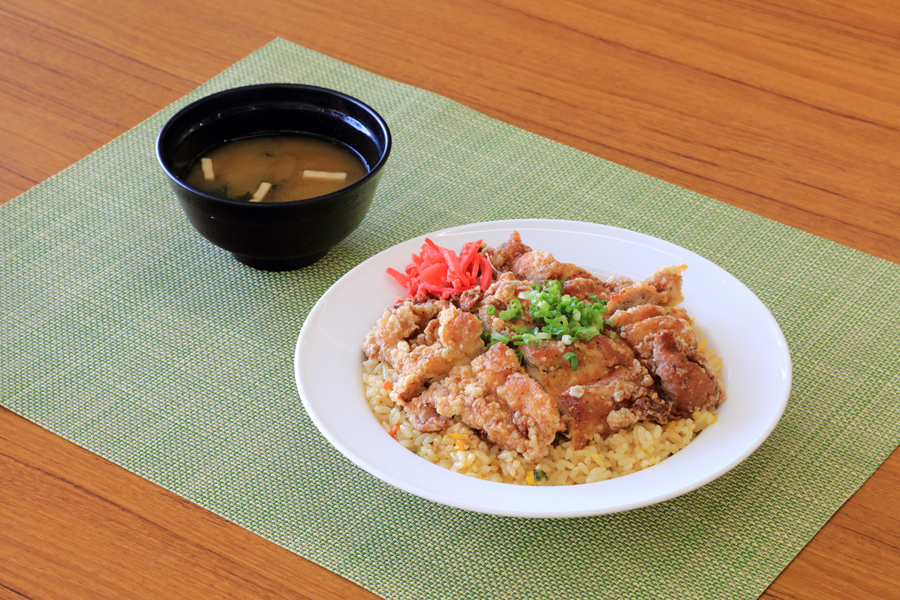 スカイプラザ2階のメインレストランには、信州の郷土料理である「山賊焼き」を使ったメニューが8種もあります。「山賊チャーハン」(写真、1,650円、スープ付)はチャーハンを覆い隠すほどの山賊焼きが乗って食べ応え十分。ニンニク、生姜を効かせたオリジナルの漬けダレに丸1日漬け込んだ鶏モモ肉は、聞けばなんと300gとボリュームたっぷりでした。