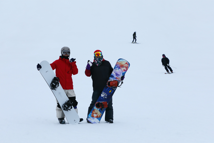 松本市からの男性(写真右)が「いつも見てます。クリスマスに有給を取って嫁(=痛板の推し)と滑りに来ました。」とお話しくださいました。また、東京都からの男性(写真左)が「昨日は、朝から降っていた雪に11時頃から雨が混じり始めました。バーンコンディションを心配しましたが、硬めで滑りやすいです。」とお話くださいました。お2人に共通の知り合いがいるということで一緒に撮らせて頂きました。