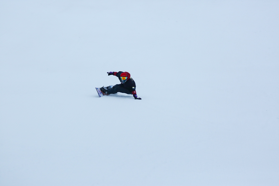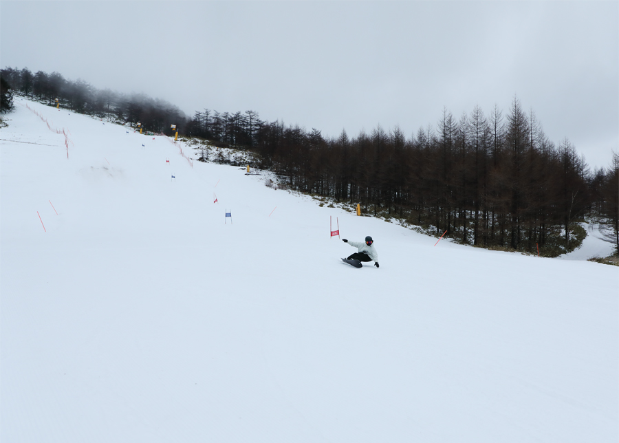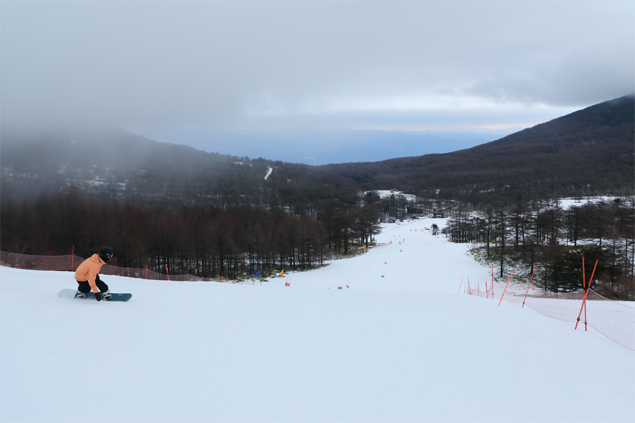 圧雪のメインバーン、ダイビングコース(写真)は、人工雪比率の高い下地が良く締まり、表面がしっとり緩んでエッジが良く効く好コンディションでした。まさにカーヴィング天国、高峰!終盤のスキーヤーズライトに積雪の薄い箇所がありましたが、目印のポールが立っており、滑りには全く影響しませんでした。