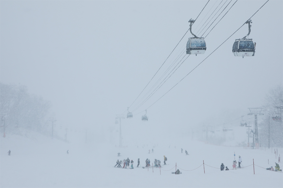 フカッとした新雪が約20cm積もったダイナミックコースは、下地に硬く締まった不規則な起伏があってテクニカル。新雪が踏まれて下地と馴染んだウッディコースは滑りやすかったです。フカフカな新雪が約20cm積もったとおみゲレンデ(写真)は年末らしい賑わいでした。