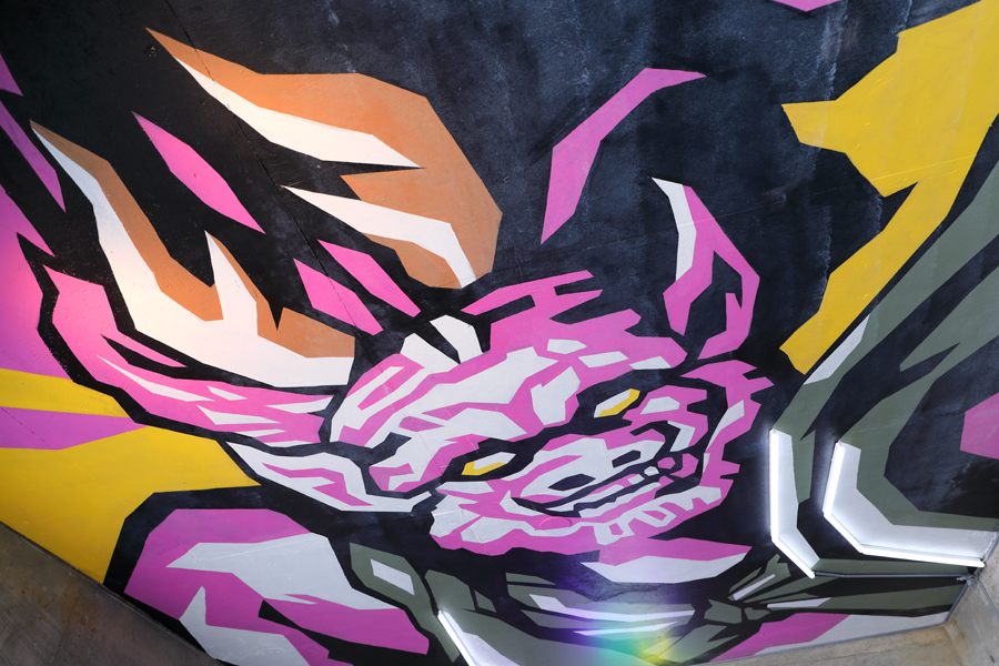 エスカルプラザの Lift Up Coffee 前の天井には、55周年を記念してアーティスト/イラストレーターの澁谷忠臣氏が手がけるグラフィックアート(写真)と、ネオンアーティストのはらわたちゅん子氏によるネオン作品があります。さて、白馬五竜&Hakuba47 では「全面可」に向けて、目下急ピッチで作業が進められています!