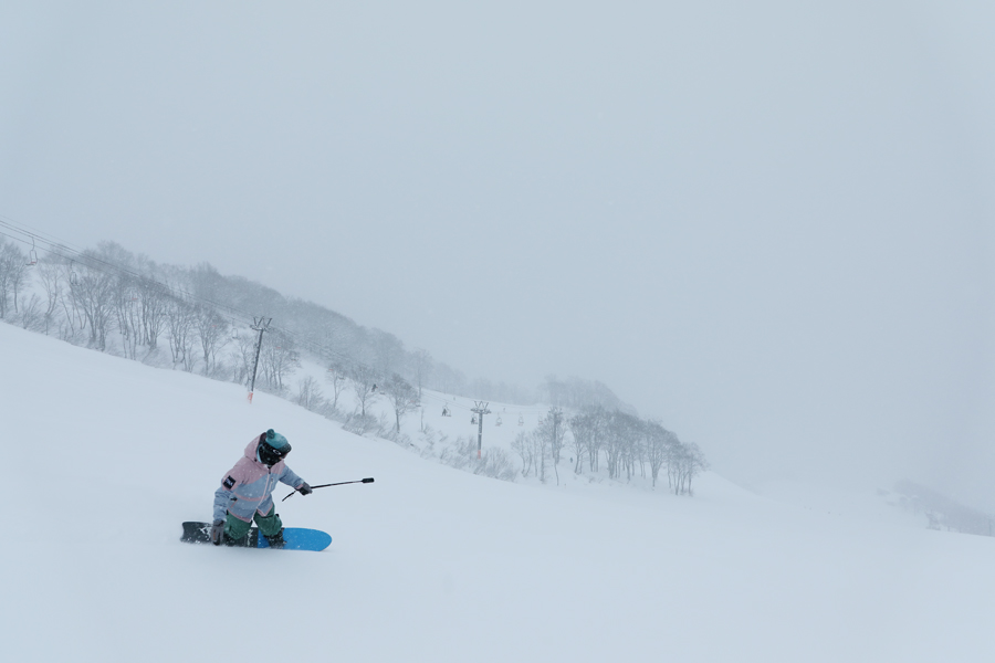 白馬村からの男性(写真)が「去年の12月は晴れの日が恋しくなるような日が続きましたが、今年の12月は雪の日が恋しかったです。ようやく降ってくれましたね!」とお話くださいました。硬い湿雪の圧雪のグランプリコースには乾いた新雪が約20cm。下地に当たるとガリッと音がしたものの久しぶりの新雪にテンションが上がりました。