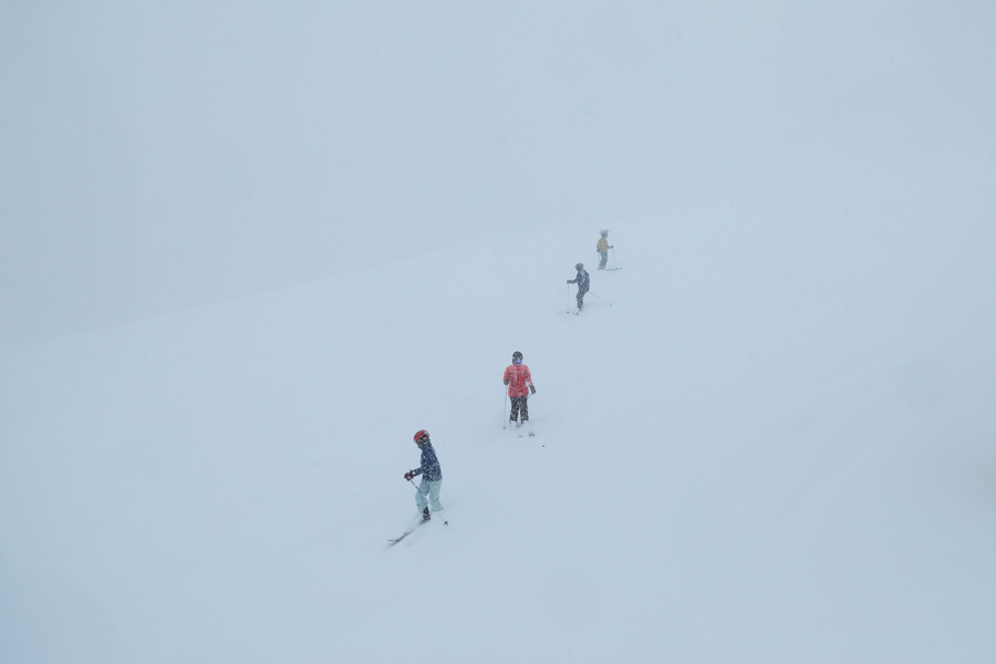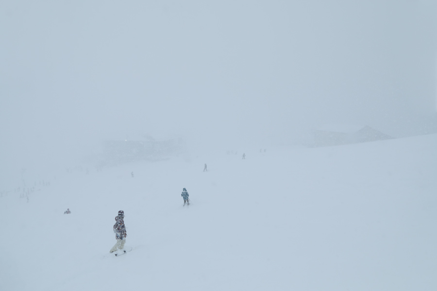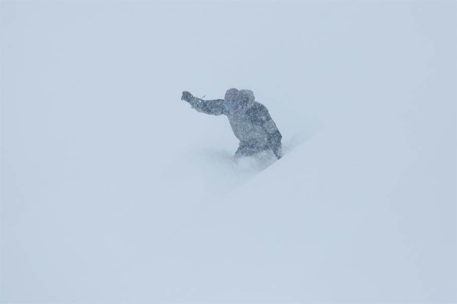 新雪が15~20cm乗った黒菱第2クワッド沿い(写真)は適度に締まった湿雪の圧雪でした。それにしてもガスと北風に乗って密度濃く降る乾いた雪で雪面が見づらい!黒菱第3ペアとスカイライン第2ペアは整備点検が長引いて営業開始が遅れていました。