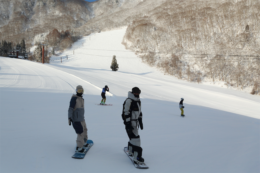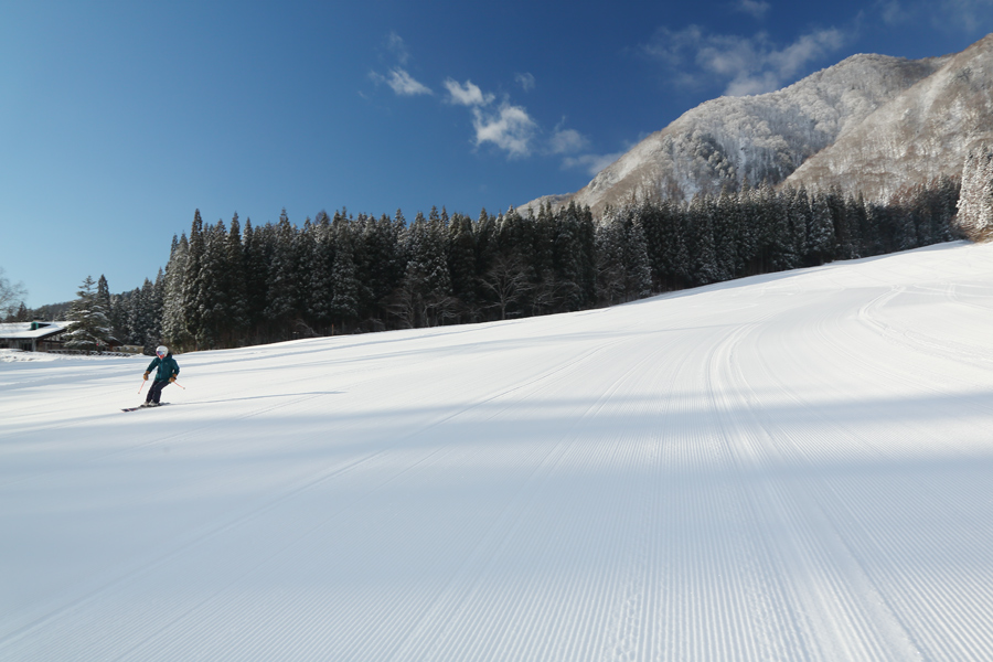 前回の取材日以降ギリギリの積雪が続きましたが、昨朝からの大雪により、一気にバーンコンディションが回復しました!適度に締まった粉雪の圧雪のカービングゲレンデ(写真)は 白馬さのさか ならではの精度の高い整備が光るフラットバーン。朝イチは特にキレのあるターンで一気に滑り降りる上級者が目立ちました。