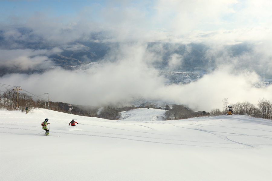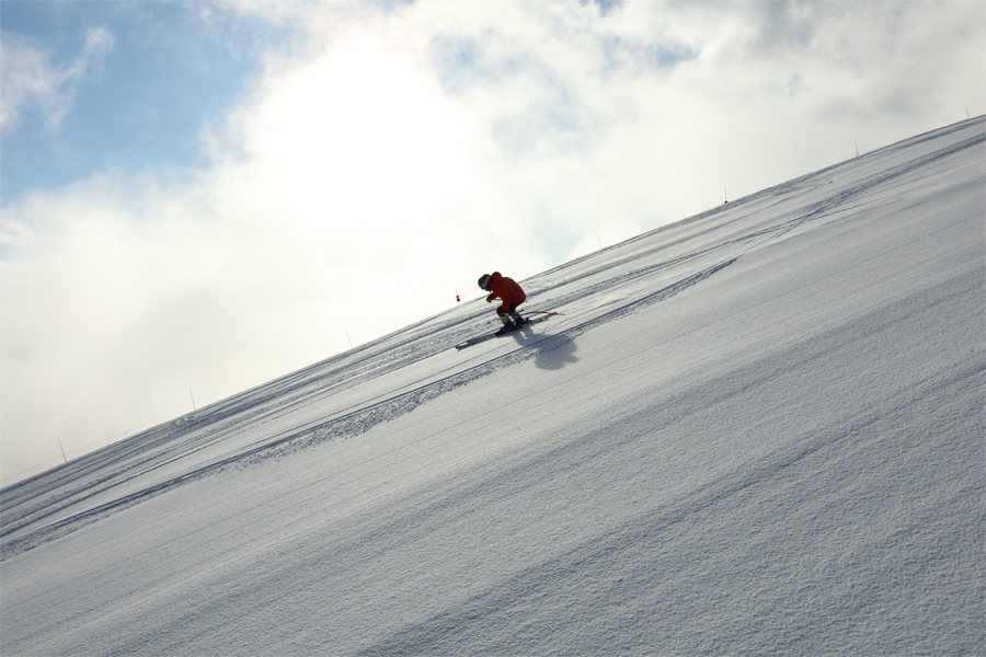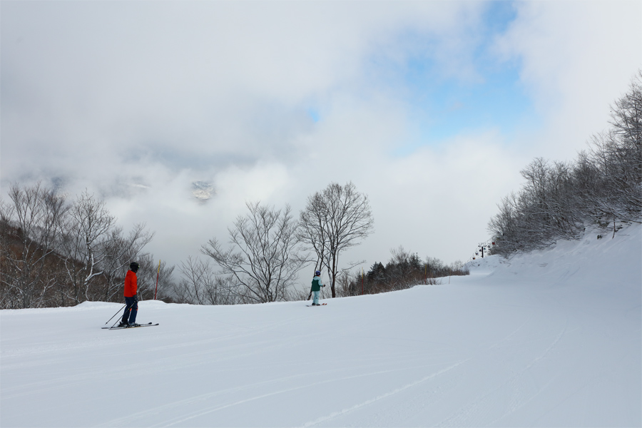 適度に締まった粉雪の圧雪のパノラマコース(写真)では軽い新雪1~5cmをかき分けながら板が気持ちよく走りました。ゴンドラ山麓駅への下山ルートとなる白樺下部は細かな起伏が連なる非圧雪バーン。ブッシュやアイシーな箇所もありました。
