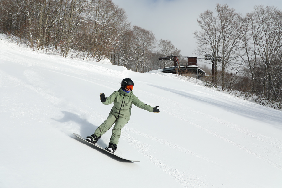 営業開始前にお会いした愛知県からのご夫婦が「いつも見てます!昨日は妙高杉ノ原、今日は池の平温泉、明日はAKAKAN で滑ります。昨日は少し重い雪でしたが今日はどうかな…?」とお話しくださいました。その後、再びお会いした時に奥様(写真)が「いい雪!」と笑顔で手を振って下さいました。圧雪のヤッホーコースでは適度に柔らかな粉雪の感触を楽しめました。