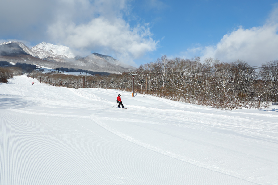 8時半頃は全天が雲に覆われていましたが、営業開始後に徐々に雲が解けて行き、やがて青空が広がり、妙高山(写真左上)を望めるようになりました。ヤッホーコースから続くドリームと、その下部で合流するハッピーゲレンデ(写真)も適度に柔らかな粉雪の圧雪でした!