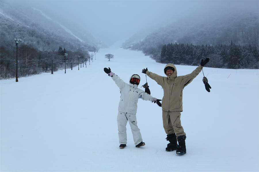営業開始前の薄暗い空のもと岐阜県からのご夫婦(写真)が「いつも見てます!コルチナ&ハクノリ共通シーズン券ホルダーです。1/2(金)まで車中泊して滑ります。」とお話しくださいました。国道148号線から駐車場までのアクセス路にはシャーベット状の雪が積もっていました。