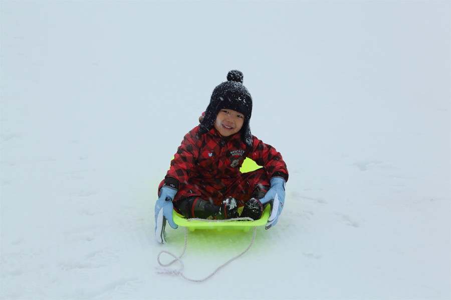 緩んでソフトな圧雪に湿った新雪が3~5cm乗った池の田ゲレンデでは気持ちよくスピードに乗れました。整備されたキッズパークも同様にソリが走るコンディション。兵庫県からのお子さん(写真)のお母さんが「ホテルグリーンプラザ白馬 に泊まっています。ホテルの食事が美味しかったです!お父さんとお兄ちゃんは滑りに行きました。」とお話しくださいました(ところで、ボクのグローブ、異様に大きいね)。