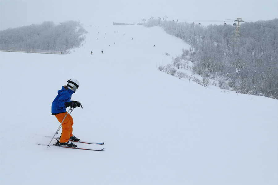 軽い新雪が2~3cm乗った兎平・南側ルート、パノラマコース、リーゼンスラロームコース序盤~中盤(写真)は良く締まった粉雪の圧雪、リーゼン終盤のウスバゲレンデは良く締まった湿雪の圧雪。硬めの起伏に新雪が約3cm乗った白樺ゲレンデにはまだブッシュが散見されました。