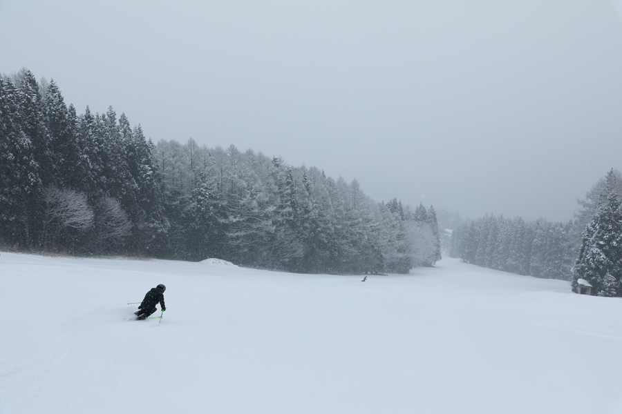 パラダイス(写真)も、レイクタウンと同様に硬く締まった湿雪の圧雪に軽い新雪約5㎝乗ったコンディション。板を走らせ新雪を切り裂くようにして滑りました。愛知県と長野県からのスキーヤーさんが「いつも見てます。昨日より滑りやすいですが、積雪的にはもう一降り、二降り欲しいですね。」とお話くださいました。