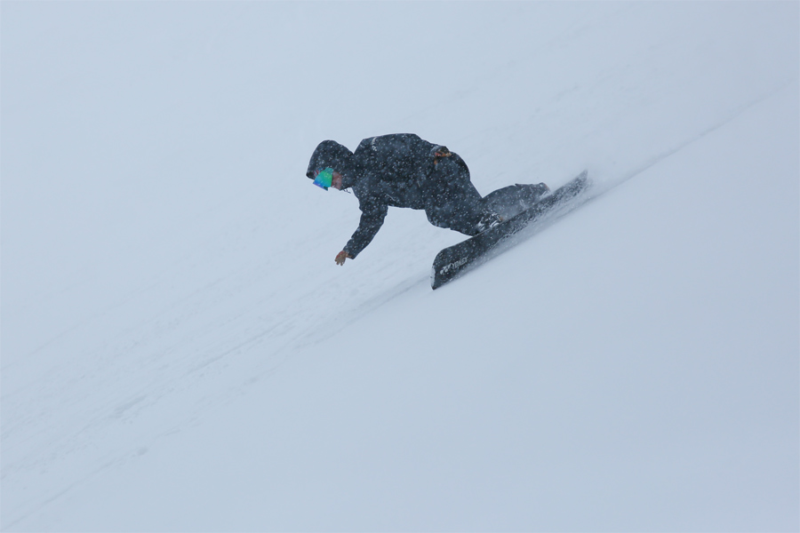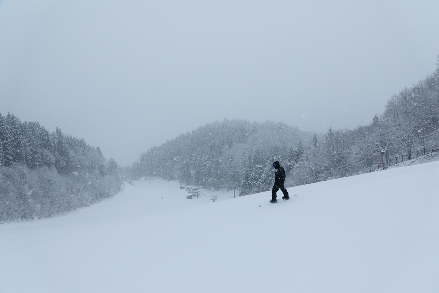 軽い新雪が約5㎝乗ったレイクダウン(写真)からレイクビューにかけては硬く締まった湿雪の圧雪バーンでした。山梨県からのスノーボーダーさんが「いつもスノーナビを欠かさずチェックしています。圧雪の上に乗った”うっすらパウダー”がとても気持ちいいですね!」とお話しくださいました。