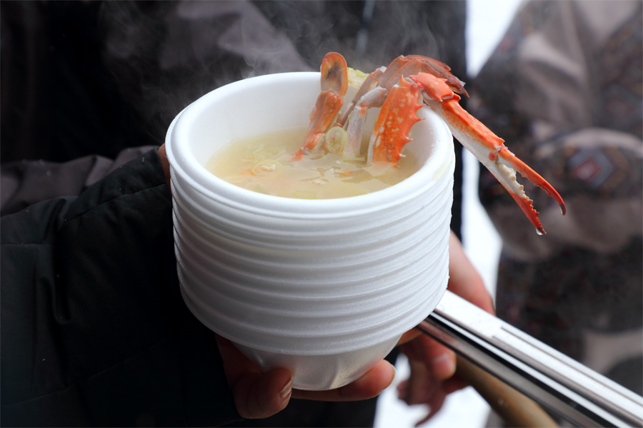 味噌仕立てのアツアツの汁に、カニ、白菜、人参、ネギが入った、12時からのカニ汁(写真)の振る舞いには、大行列が出来ました。用意された大鍋は約200人分。冬型の気圧配置のもと寒い日だったので、特に美味しく感じました。