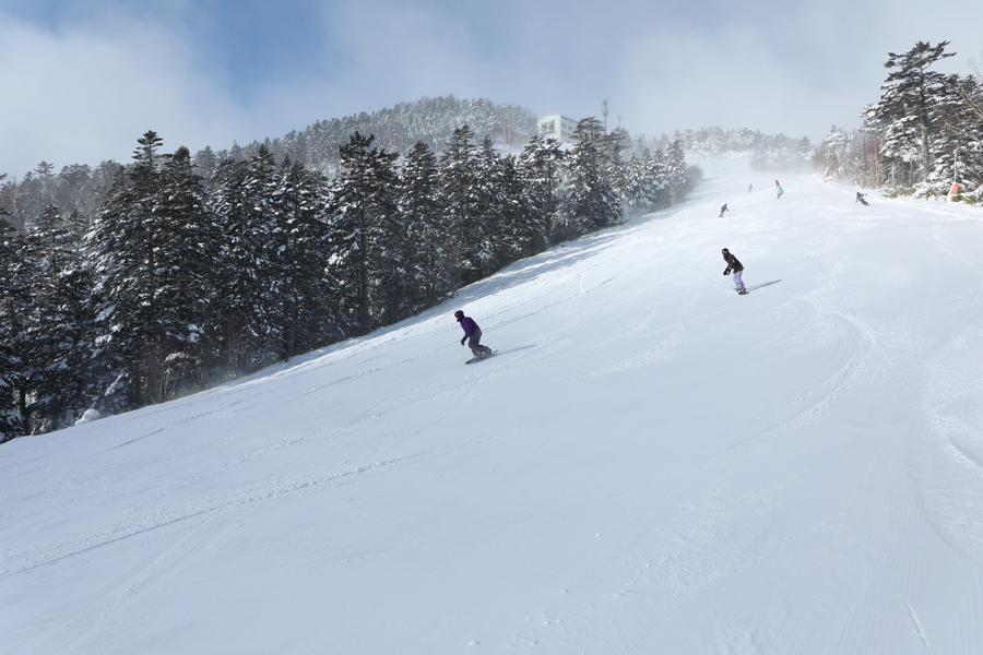 スキー場トップは風が強くて、日が差す場面もありましたが、乾いた雪が降り続いていました。粉雪の圧雪の三笠ウィングコース(写真)ではトッピングされた5~10cmの新雪の感触を味わいつつスピードに乗れました。ファミリーコースは適度に締まった粉雪の圧雪でした。