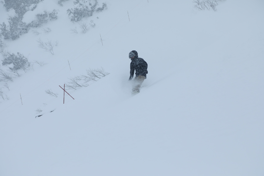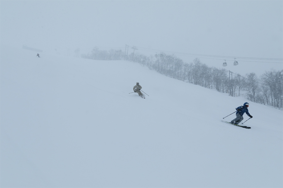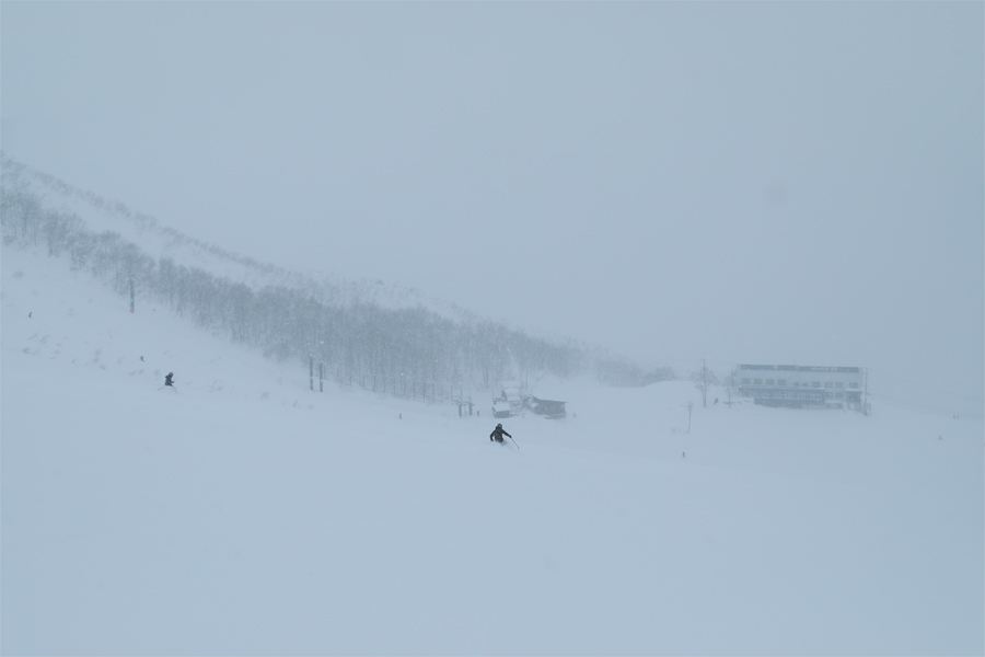 適度に締まった粉雪の圧雪に軽い新雪が約10cm乗ったスカイラインコースの中央部分と北尾根第3ペア沿いも黒菱第2クワッド沿いと同様に滑りやすかったです。良く締まった起伏が出来たスカイラインコースの非圧雪部分には新雪が約20cm。9時半頃になると雪の降り方がさらに強まりました。