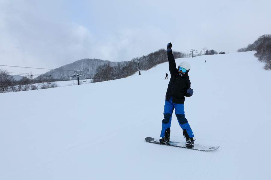 「いつも見てます!仕事が忙しくて今まで滑れませんでした。今日が初滑りです。」とは小谷村在住の女性(写真)。冬将軍が本気を出すのが遅かった今シーズンは、新しい板で全ゲレンデを滑りたいなら今日からがベストです。粉雪の圧雪の丸山ゲレンデと白樺ゲレンデも適度に締まった滑りやすいコンディションでした。