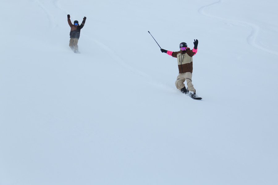 下地に柔らかな起伏があったニューパラダイスにはフワッとした新雪が20~25cm積もっていました。「Snownaviさーん!最高、気持ちいい!」と叫びながらニューパラダイスを滑り降りて来たのはこちらのお2人(写真)。また、お会いしたスキーヤーさんが「思ったより浮遊感を楽しめました。」とお話しくださいました。
