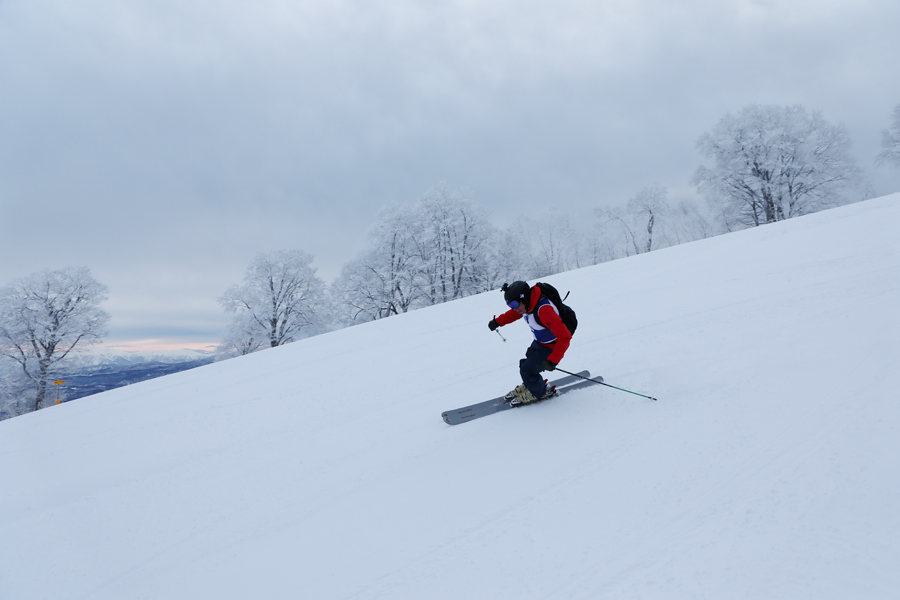 ギュッと締まった粉雪の圧雪のやまびこゲレンデDコース(写真)ではエッジが吸い付くように嚙み込みました。白馬村からのスキーヤーさん(写真)がこのあと「滑りやすくて気持ち良かったです。ところで、私は Snownavi で2016年にニュージーランドのゲレンデレポートを行った時のレポーターですよ。」とお話くださいました。