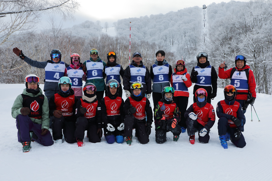 粉雪の圧雪のやまびこゲレンデEコースはDコースよりも引き締まった感触でした。「楽しいね!」とは参加された外国からの男性(写真後列左から3番目)。また、野沢温泉スキークラブ の森晃会長と 旅館さかや の森女将が「いつもお世話になっています。このファーストトラックの参加費の一部が選手の育成強化に充てられます。あと7回行われるので、是非 Snownavi をご覧の皆さん、遊びに来てください。」とお話くださいました。