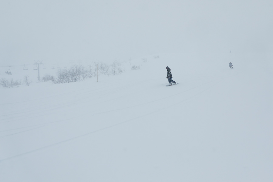 奥添地ランランコースやスイスイコースもグイグイと同様に滑りやすい粉雪の圧雪!下山時は、ギンギンコースからビュンビュンコース、長峰ランランコースと滑りました。湿雪が良く締まった起伏のギンギンには少し湿った新雪が約10㎝、適度に締まった湿雪の圧雪のビュンビュン~長峰ランランには湿った新雪が5~10㎝。取材中に密度濃く降っていた雪がお昼頃にさらに強まりました。