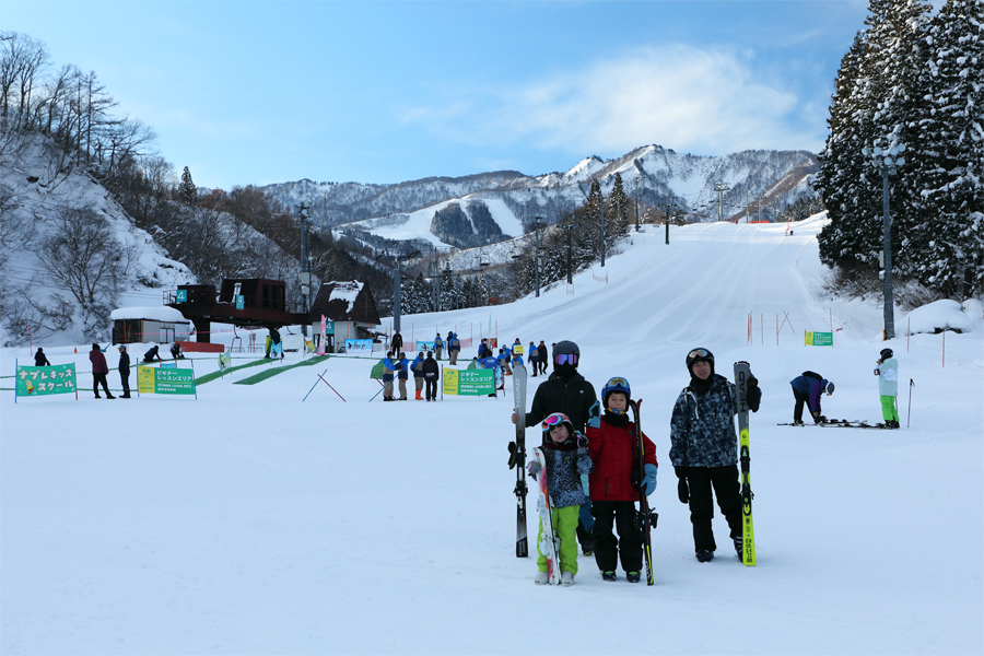 全国で数少ないスキー専用ゲレンデ、NASPAスキーガーデン!コンパクトな設計ながら全8コースが上手くレイアウトされて、初級者から上級者まで滑りを存分に楽しめます。東京都からのご家族(写真)が「この3連休は湯沢に滞在して色々なスキー場で滑ります。」とお話しくださいました。