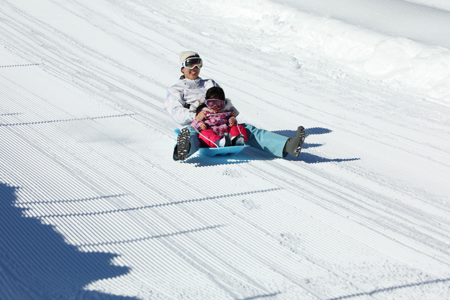 Bコースのボトムにある、ネットでセパレートされた「Pingu fun fun Kids Garden」もきれいに整備されていました。「この子はスキーデビューを済ませていますが、ソリが気に入って、ずっとここで遊んでいます。」とは千葉県からのお母さん(写真)。動く歩道もあって楽に登り返しできました(※入場券は大人・2歳以上共通、1日券2,500円、3.5時間券2,000円)。
