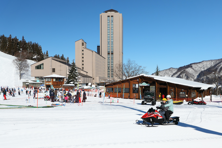 「ファーストアドベンチャーエリア」ではスノーモービルの乗車体験も(写真)。15歳以上の方は1人で乗車でき(※1回1,500円)、3~14歳の子供は保護者またはガイドと2人で乗車できます(※1回2,000円)。同エリアではスノーラフティング、スノーナイトバギーツアーも楽しめます。
