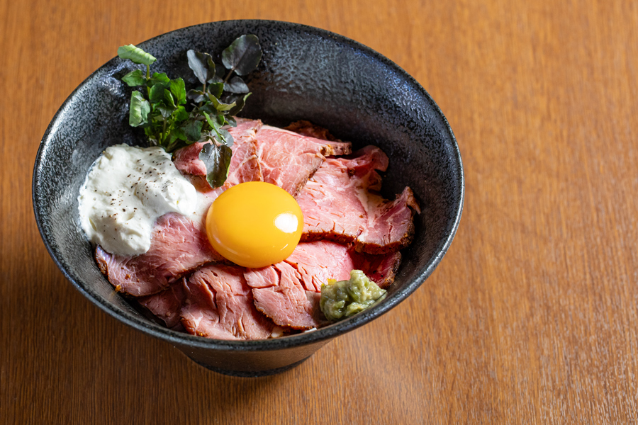 三元豚の贅沢肉厚カツカレー、醤油チャーシュー麺 とご紹介して来た カフェテリア イエティ の、一番人気のメニューは「安曇野産わさびのローストビーフ丼」(写真、2,300円、味噌汁付き)です。低温調理でゆっくりと火を通したローストビーフに、醤油ベースのオリジナル甘だれソース、プレーンヨーグルト、卵黄、安曇野産の刻みわさびがよく合って美味しかったです!