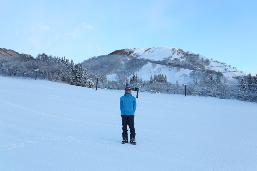 早朝まで吹いていた風が止み、3連休最終日は穏やかな晴天となりました。営業開始前に和歌山県からの男性(写真)が「いつも見てます。自宅から遠いのでなかなか来れないのですが、月2ペースで滑りに来ています。ハイウェイを滑ってからスカイビュー(写真奥)に向かうのでは遅いですかね。」とお話しくださいました。